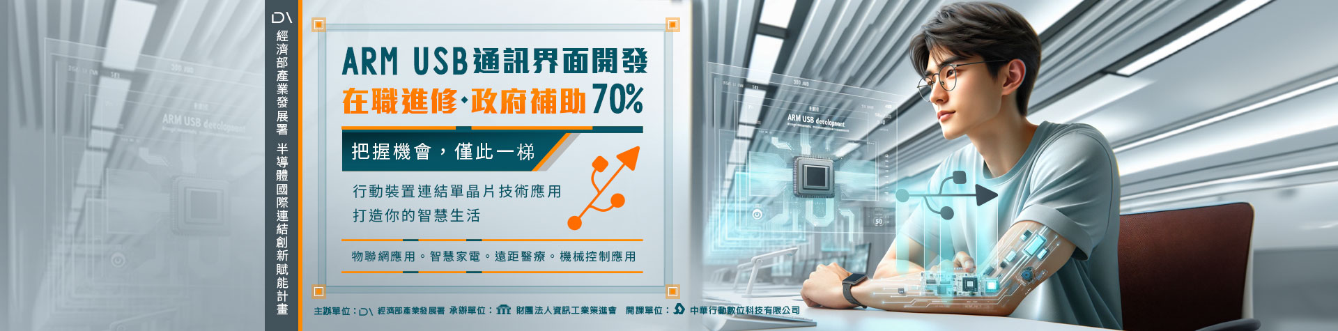 隨著ARM對USB裝置支援的普及,愈來愈USB設備可直接連結ARM平台。本課程由USB通訊協定入門,帶領學員了解各類不同USB類別設備,進而透過中心自行研發ARM USB單晶片開發平台,開發撰寫各類不同USB 類別韌體,並搭配不同HOST平台間驅動程式與應用程式,窺探USB HOST平台與USB 裝置間的通訊流程。透過本課程豐富的周邊應用範例,學員們將對ARM USB控制更加了解。