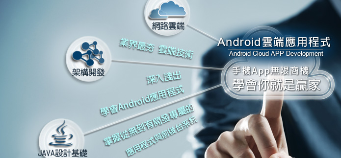 Android 雲端應用程式開發課程以業界需求的 Java 技術為主,完全不具程式設計基礎開始,由淺入深且實務操作的方式,逐步將學員培養成為能夠獨立自行開發 Java 與 Android 雲端應用程式。並且透過 Java 跨平台特性,讓你具備 Android 雲端應用程式的開發能力。課程的階段性銜接脈絡清晰、循序漸進,有助於學員完整吸收課程精華,快速進入 Java 與 Android 雲端應用程式開發領域並擁有專業的就業競爭力。