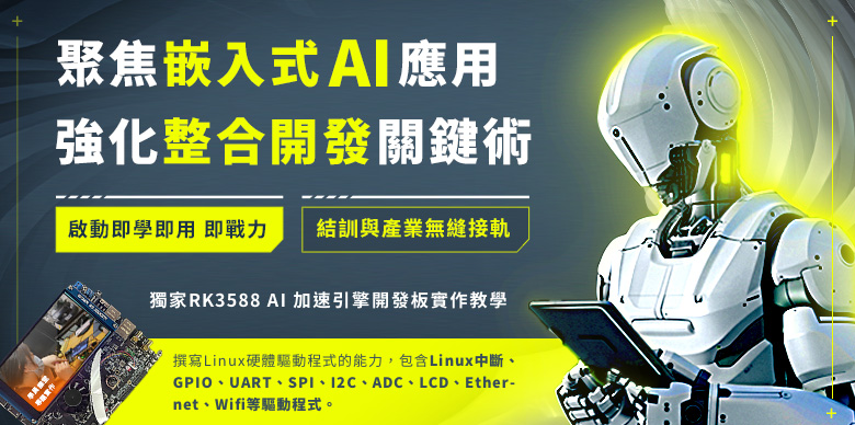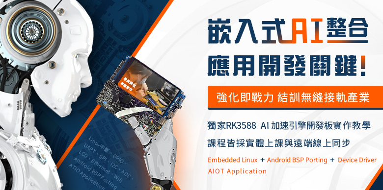 此套裝課程依序從基礎入門至深入研究,每個單元都可以讓學員豁然開朗。從Linux系統程式至嵌入式Linux平台架設再導入OpenCV影像擷取應用及linux驅動程式撰寫,講師傳授各個項目的內容及實作練習巨細靡遺,不藏私。課程著重在嵌入式系統架構開發環境的整合與應用,讓學員進入嵌入式系統平台的AI人工智慧學習大門深入淺出。並且強調業界實務為導向的課程內容,讓學員可以從中瞭解全盤的相關應用與技術技巧及範例練習訓後接軌業界。課程的階段性銜接脈絡清晰、循序漸進,有助於學員在最短的時程內完整吸收課程的精華,快速踏入嵌入式領域並擁有專業的就業競爭力。