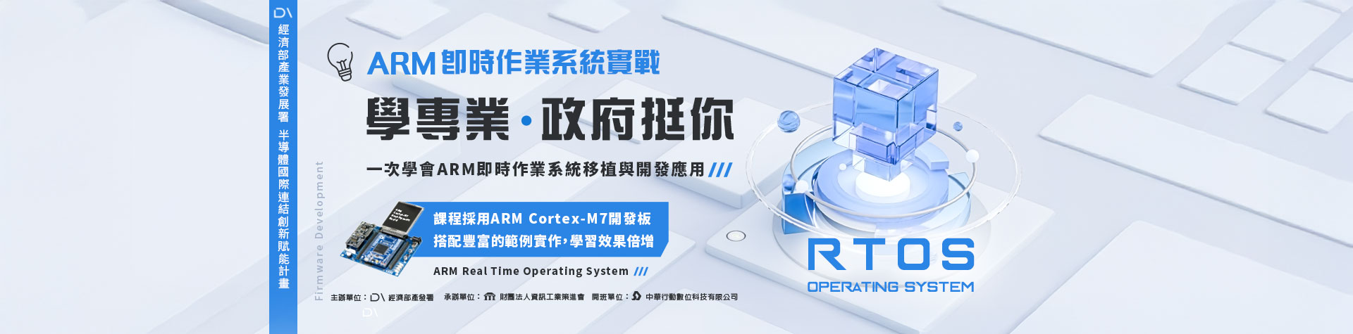 本課程使用目前業界最廣泛應用的ARM Cortex-M7單晶片核心,學習即時作業系統移植與開發應用,首創一次學會即時作業系統,uC/OS-II與FreeRTOS在業界應用上都佔有一席之地。