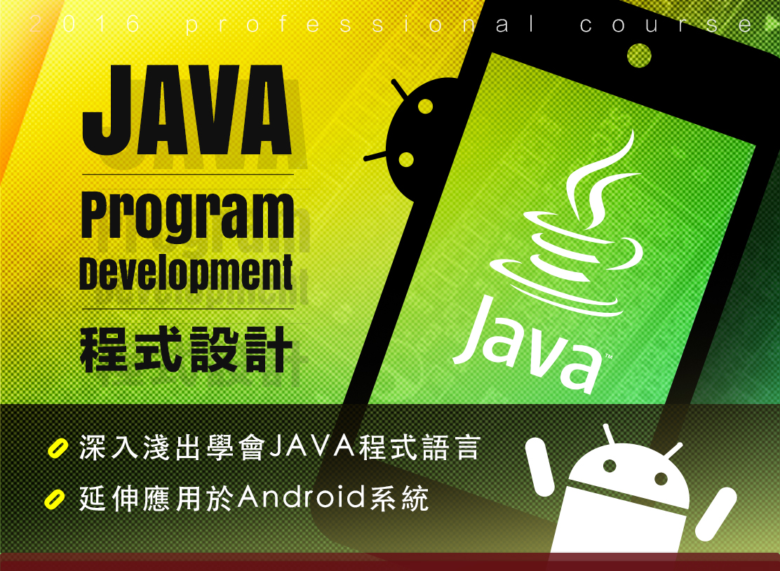本Java程式設計課程以業界需求的Java技術為主,完全不具程式設計基礎開始,由淺入深且實務操作的方式,逐步將學員培養成為能夠獨立自行開發Java程式。並且透過Java跨平台特性,讓自已具備Android APP與雲端應用程式的開發能力。